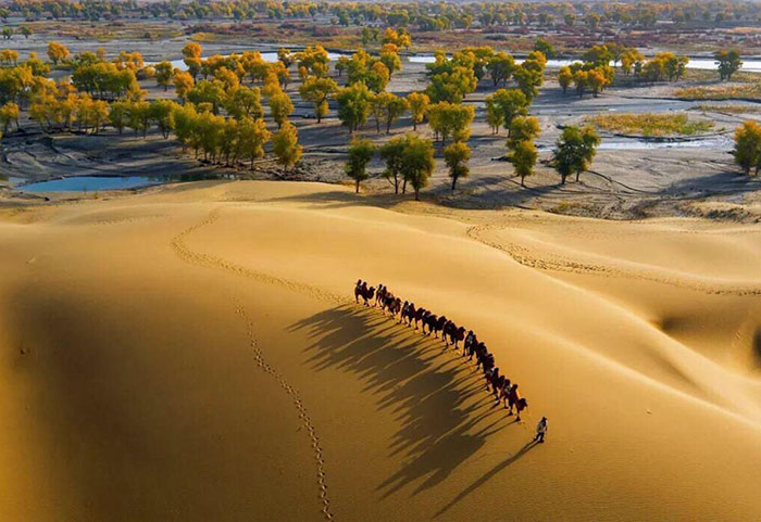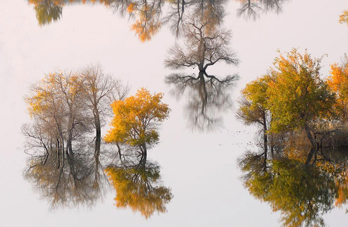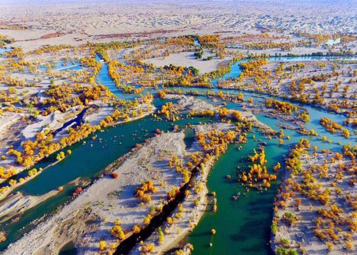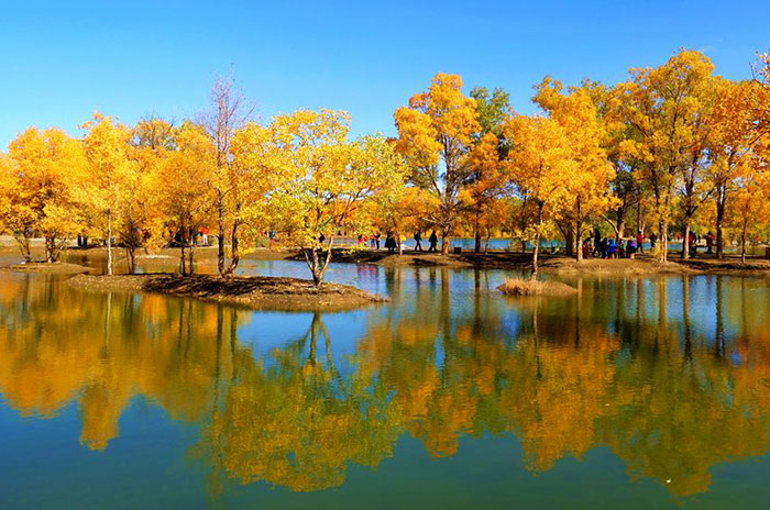 秋になると、黄色に染められた胡楊の木、タリム河の水面に映し、秋のパノラマが広がります。