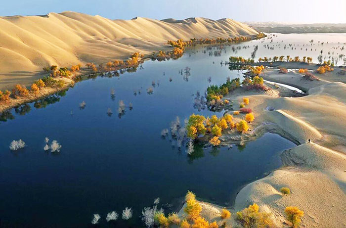 タクラマカン砂漠を流れるタリム河の畔にある草湖郷、中国で一番広い胡楊の原生樹林に囲まれており、「胡楊水郷」とも呼ばれる。